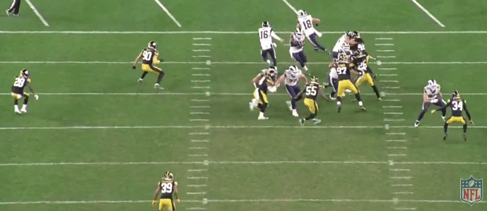 A similar play to the one above happened later in the 2019 season against the Pittsburgh Steelers. The only difference is that the Rams used a ghost motion by Receiver Cooper Kupp instead of jet motion. the difference is that ghost motion has the receiver motion behind the mesh point, and jet motion is in front. On the play below, the backside edge player, TJ Watt (#90) gets too far up the field because of the ghost motion. This leaves another big cutback lane for Gurley to run through.