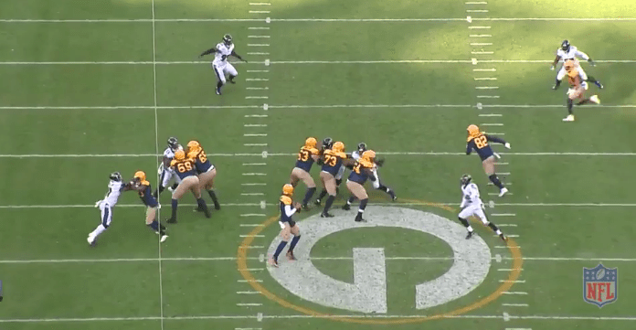 The second example is from 2017 with Pees’ Ravens against the Green Bay Packers. ravens show a clear as day Cover 1 look pre-snap. They have one deep safety, with their corners pressed and aligned over each detached receiver. the Ravens also show an overload pressure look to the bottom of the screen.