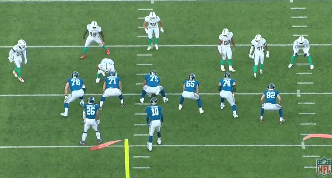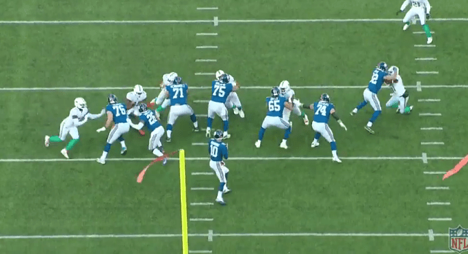 Later in the year in week 15 against the Giants, the Dolphins once again were able to get a free rusher with the amoeba front. This time, the dolphins have no down lineman, as opposed to one in the previous example.